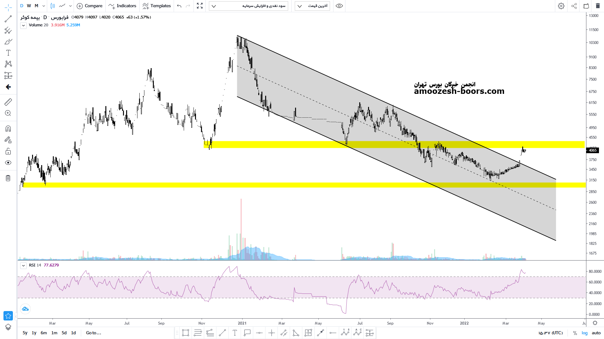 کوثر در اینترمدیت نزولی در حال حاضر با ایجاد واگرایی مثبت در محدوده حمایت استاتیک واقع شده و محتمل هست درین منطقه بیس سازی نماید وبه سمت تست مقاومت 4300 از تلاقی سقف کانال و قله قیمتی حرکت نماید. حمایت معتبر سهم در صورت از بین رقتن حمایت استاتیک منطقه 3000 میباشد .