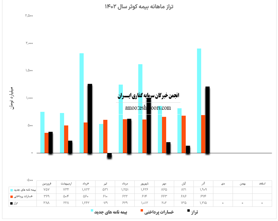 همچنین کوثر در آذر ماه مبلغ 694 میلیارد تومان به بیمه نامه های خود خسارت پرداخت کرده که این میزان با افزایش 1 درصدی نسبت به ماه گذشته روبرو شده و لذا با توجه به آمار مذکور تراز کوثر با 800% افزایش در مقایسه با ماه گذشته به مثبت 1215 میلیارد تومان رسیده است.