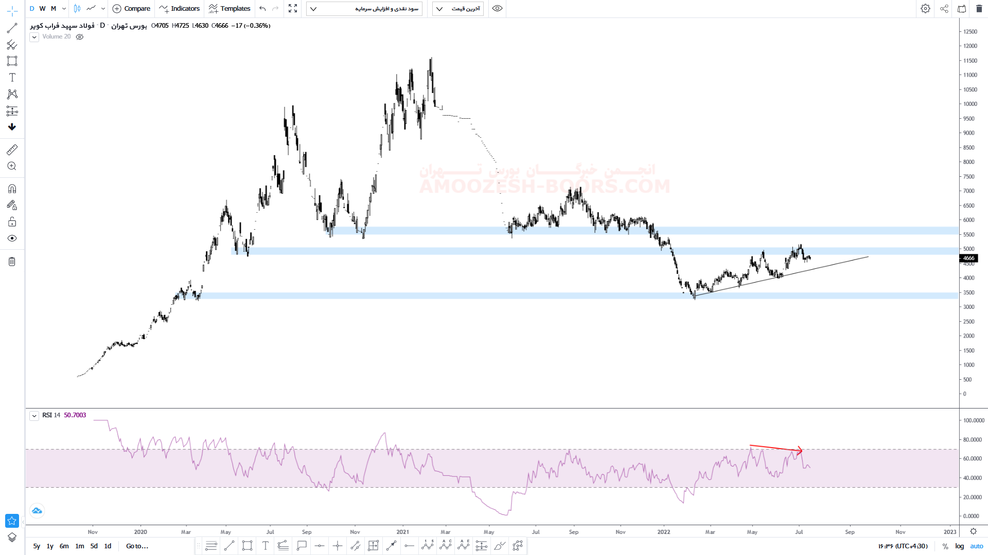 قیمت سهم کویر پس از تست دوباره ناحیه مقاومتی ۴۹۰ تومان با ایجاد واگرایی منفی مجدداً نتوانسته از سد راه این مقاومت عبور کند لذا محدوده حمایتی خط روند صعودی را پیش روی خود دارد که در صورت حمایت می تواند برای سومین بار ناحیه مقاومتی ۴۹۰ الی ۵۰۰ تومان را تست کند اما در صورت از دست دادن خط روند صعودی میتواند اصلاح خود را تا کف حمایتی ۳۵۰ تومانی ادامه دهد.