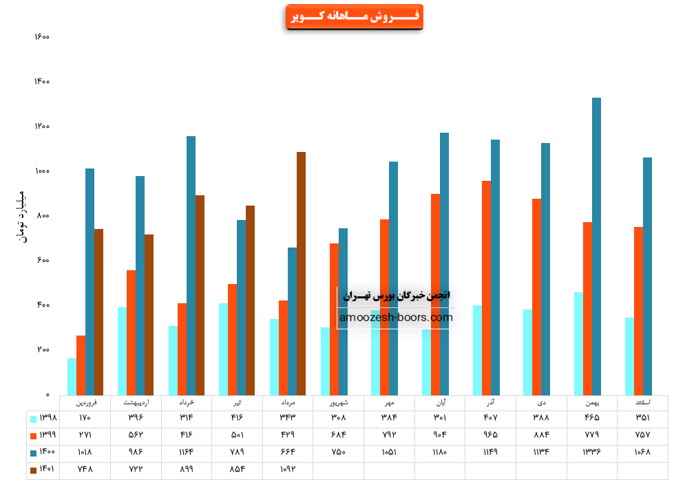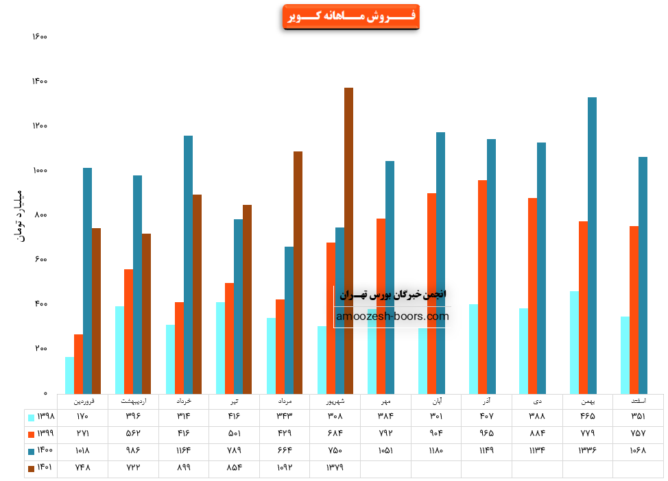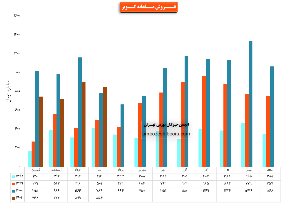 نماد کویر (شرکت توليدي فولاد سپيد فراب کوير) در تیر ماه سال ۱۴۰1 حدود مبلغ 854 میلیارد تومان درآمد داشته که این میزان در مقایسه با ماه گذشته 5% کاهش و همچنین در مقایسه با مدت مشابه سال گذشته 8% افزایش درآمد پیدا کرده است.