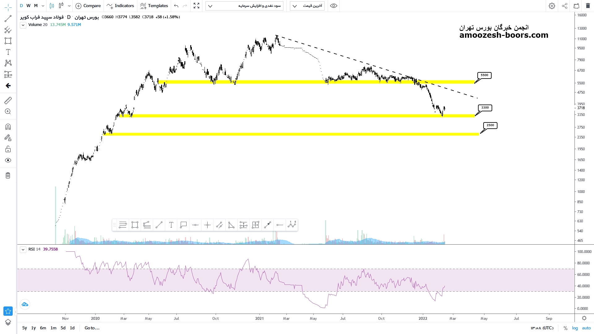 در صورت حمایت از این محدوده قیمت می تواند تا مقاومت خط روند نزولی خود و در صورت شکست آن تا مقاومت ۵۵۰ تومان صعودی را تجربه کند اما در صورت برگشت مجدد و شکست این حمایت نزول تا محدوده ۲۵۰ تومان می تواند ادامه داشته باشد.