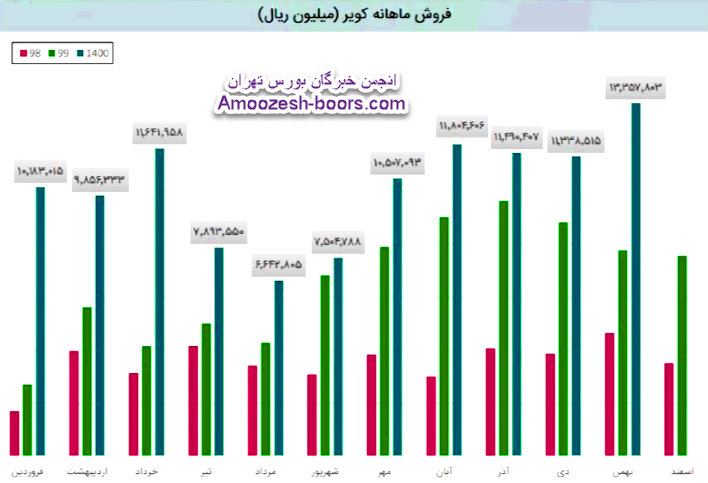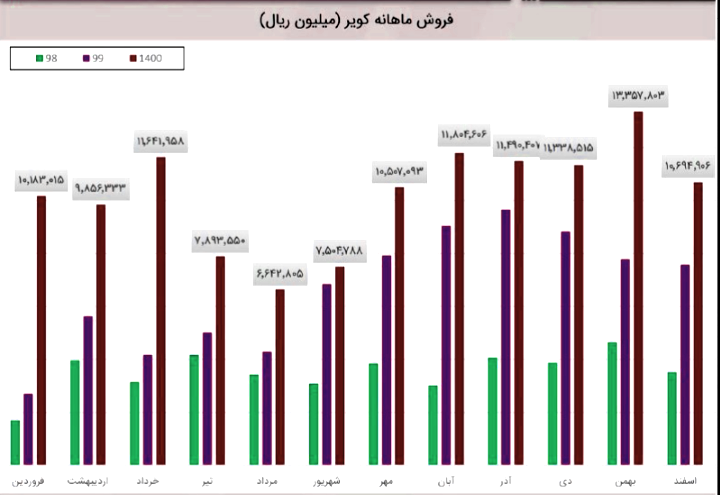 شرکت توليدي فولاد سپيد فراب کوير با نماد کویر در خرداد ماه سال ۱۴۰1 حدود مبلغ 899 میلیارد تومان درآمد داشته که این میزان در مقایسه با ماه گذشته 25% افزایش و همچنین در مقایسه با مدت مشابه سال گذشته 23% کاهش درآمد پیدا کرده است.
