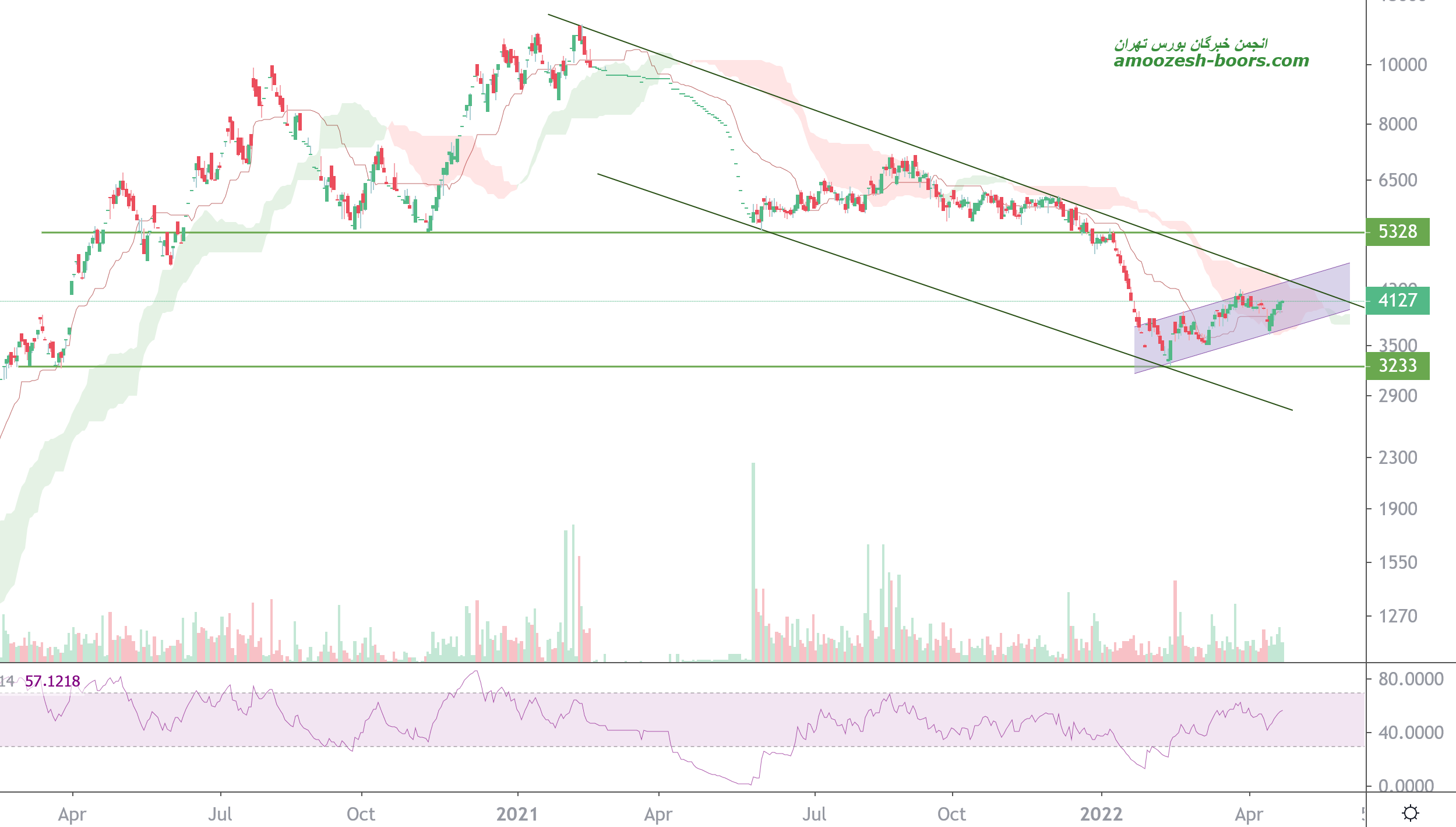 قیمت در حال حاضر در کانال صعودی کوتاه مدتی در حال صعود میباشد و در صورت ادامه دار شدن تقاضا مقاومت سهم تلاقی سقف کانال صعودی کوتاه مدتی و مقاومت داینامیک نزولی در محدوده 4500 ریال در نظر گرفته خواهد شد و در صورتی که قیمت وارد فاز اصلاحی شود حمایت سهم کف کانال صعودی خواهد بود.