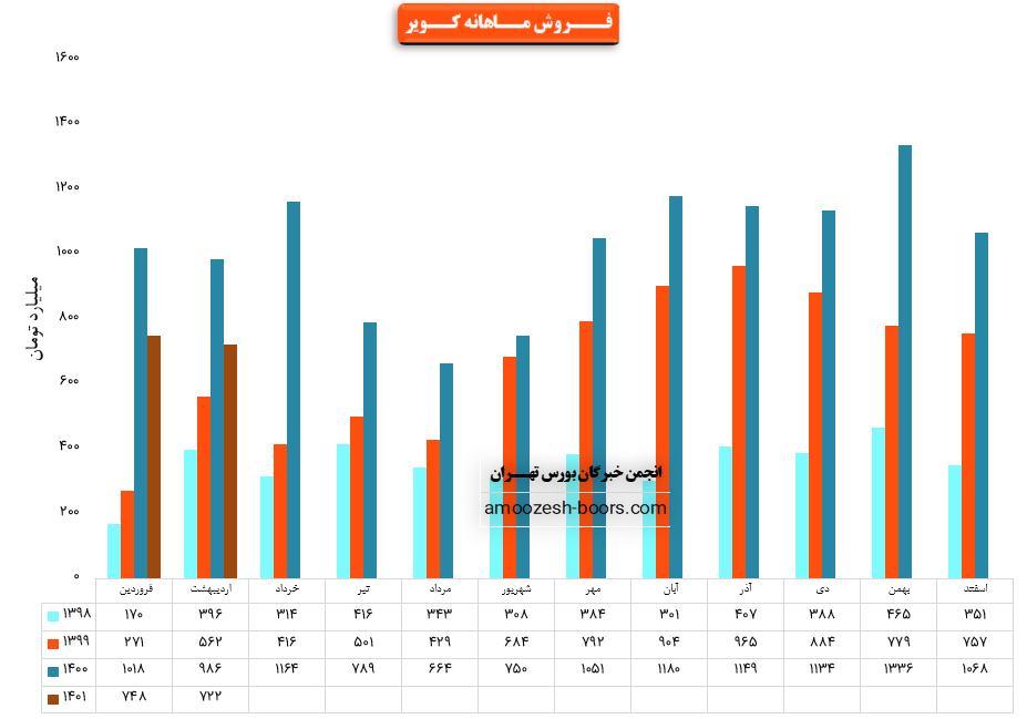 شرکت تولیدی فولاد سپید فراب کویر طی عملکرد 1 ماهه منتهی به 1401/01/31 معادل 7,480,561 میلیون ریال از محصولات خود را به فروش رسانده است که نسبت به دوره 1 ماهه مشابه سال قبل 27% کاهش داشته است.هچنین نسبت به ماه قبل کاهش 30 درصدی و نسبت به میانگین ماه های گذشته کاهش 27 درصدی نشان می دهد. فروش فروردین امسال نسبت به سال قبل 27 درصد افت کرده است. کویر در این ماه 20930660 کیلوگرم انواع میلگرد شاخه و کلاف را به فروش (داخلی) رساند که کاهش 33 درصدی نسبت به ماه گذشته نشان می دهد همچنین نرخ فروش این محصول نسبت به ماه قبل افزایش 13 درصدی داشته است.