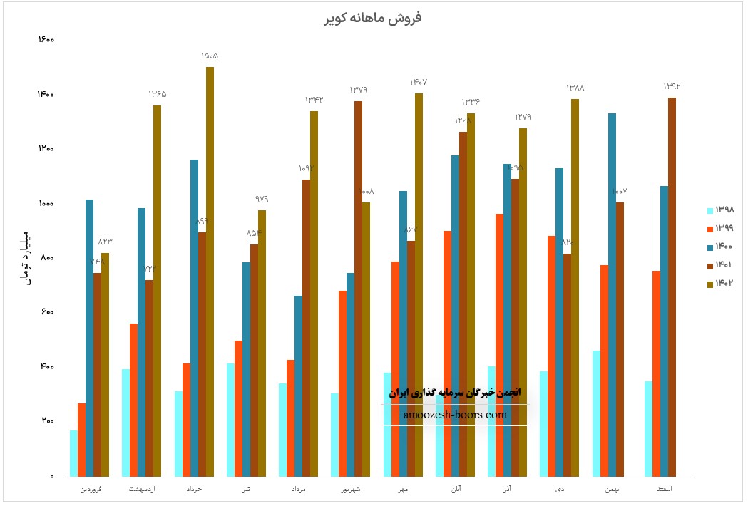 نماد کویر (شرکت توليدي فولاد سپيد فراب کوير) در دی ماه سال 1402 حدود مبلغ 1388 میلیارد تومان درآمد داشته که این میزان در مقایسه با ماه گذشته 9% و همچنین در مقایسه با مدت مشابه سال گذشته 69% رشد پیدا کرده است.