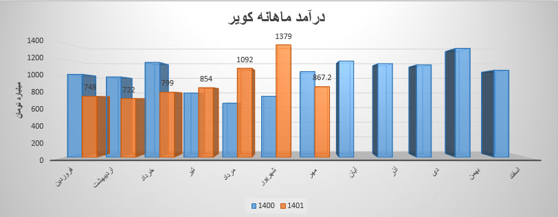 همچنین کل درآمد سال گذشته کویر 122.942 میلیارد ریال گزارش شده است . کویر مجموعا طی عملکرد 8 ماهه سال مالی به درآمد 78297 میلیارد ریالی رسیده و با وجود رشد درآمد 3 درصدی نسبت به مدت مشابه سال قبل، موفق به پوشش 64 درصدی از کل بودجه سال گذشته نیز گردیده است .