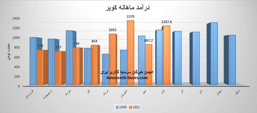 شرکت تولیدی فولاد سپید فراب کویر (نماد کویر) در گزارش فعالیت آبان ماه 1401 به درآمدی به مبلغ 12,67.6 میلیارد تومان رسیده است . 51% از درآمد آبان ماه سهم کویر از طریق صادرات و مابقی از طریق فروش داخلی تامین شد . تغییرات درآمد ماهانه سهم کویر به شرح زیر میباشد :
