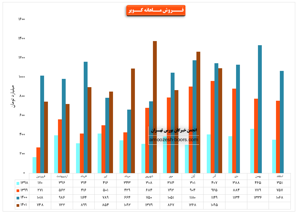 مقدار فروش نماد کویر نسبت به ماه قبل افت 41 درصدی را ثبت کرده و نسبت به میانگین ماههای گذشته 4.4 درصد افت داشتهاست. نرخ این محصول در مهر ماه با افزایش 4 درصدی نسبت به نرخ فروش ماه گذشته 170 میلیون ریال به ازای هر تن گزارش شده است.