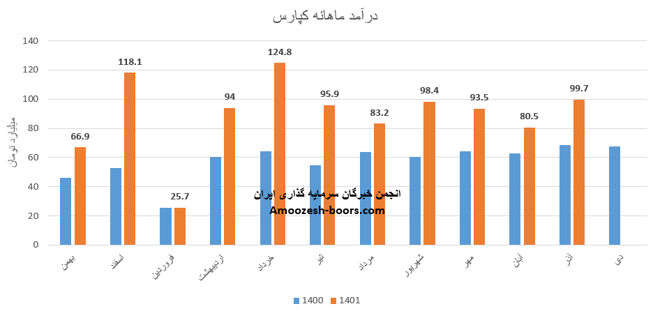 فروش آذر ماه سال 1402 سهم کپارس 99.7 میلیارد تومان گزارش شده است که از این رقم 67% از محل فروش داخلی و مابقی آن از طریق فروش صادراتی تامین گردیده است، تغییرات درآمدی کپارس به شرح زیر میباشد: