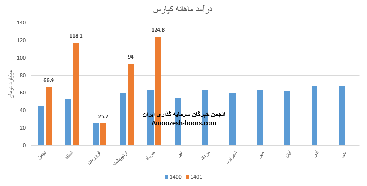 فروش ماهانه شرکت کاشی پارس به 124.8 میلیارد تومان رسیده که 43% از این درآمد از طریق فروش صادراتی و مابقی به فروش داخلی رسیده است، سهم کپارس در پنجمین ماه از سال مالی موفق به ثبت رکورد جدیدی در گزارش ماهانه شده به طوری که افزایش 33 درصدی نسبت به ماه گذشته و افزایش 94 درصدی نسبت به مدت مشابه داشته است، انواع کاشی پر سلان محصول اصلی نماد کپارس میباشد که در مقایسه با ماه گذشته افزایش 33 درصدی مقدار فروش را تجربه نموده است، نرخ فروش این محصول تغییری نداشته است، مجموع عملکرد 5 ماهه سهم کپارس نسبت به مدت مشابه افزایش 73 درصدی داشته و طی این مدت 62% از کل درآمد سال گذشته پوشش داده شده است.
