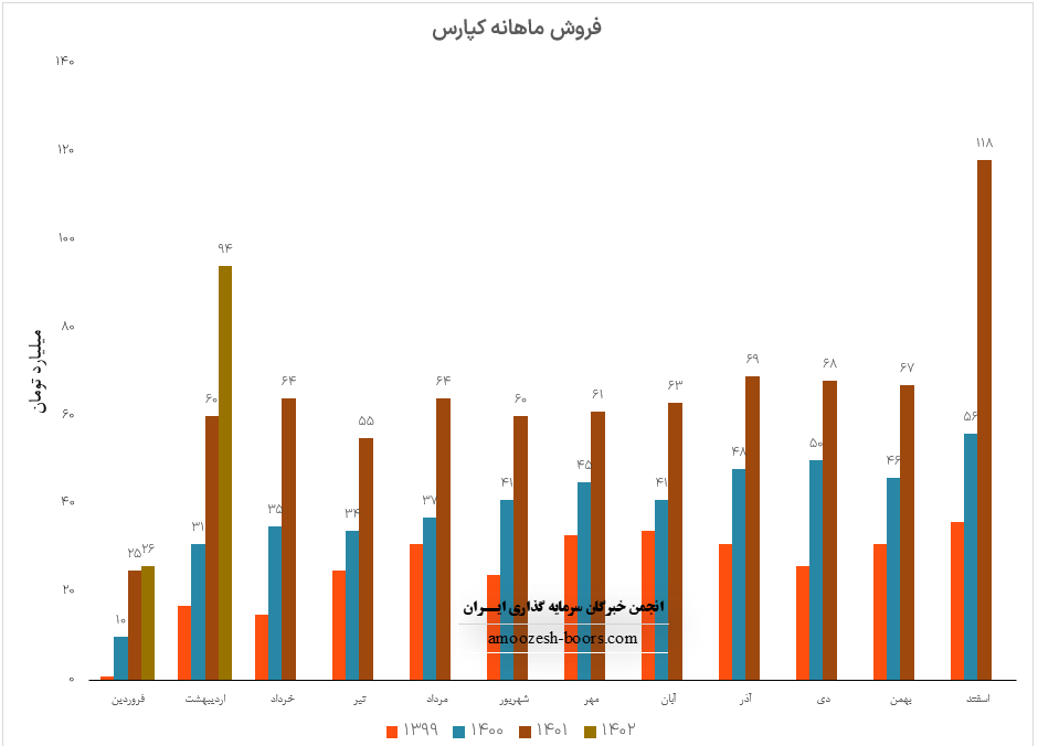 نماد کپارس با ثبت درآمد 66.9 میلیارد تومانی، به درآمد خطی خود ادامه داد، 44% از این درآمد از طریق فروش صادراتی و مابقی از طریق فروش داخلی تامین گردید، بیشترین وزن سبد فروش داخلی سهم کپارس مربوط به انواع کاشی پر سلانی میباشد که مقدار و نرخ فروش این محصول نسبت به ماه گذشته با افزایش 7 درصدی رو به رو بوده است، مجموع درآمد نماد کپارس نسبت به مدت مشابه رشد 58 درصدی را تجربه نموده است.