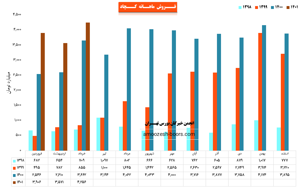 کچاد در فروردین به فروش 39060 میلیارد ریالی رسیده است (90%) درصد از درآمد شرکت درین ماه مربوط به فروش داخلی و (10%) درصد آن مربوط به کل صادرات شرکت است. شرکت نسبت به دوره 1 ماهه مشابه سال قبل 53% افزایش درآمد داشته است.درآمد شرکت مشابه سال قبل و نسبت به میانگین ماه های گذشته افزایش 3% را نشان می دهد.
