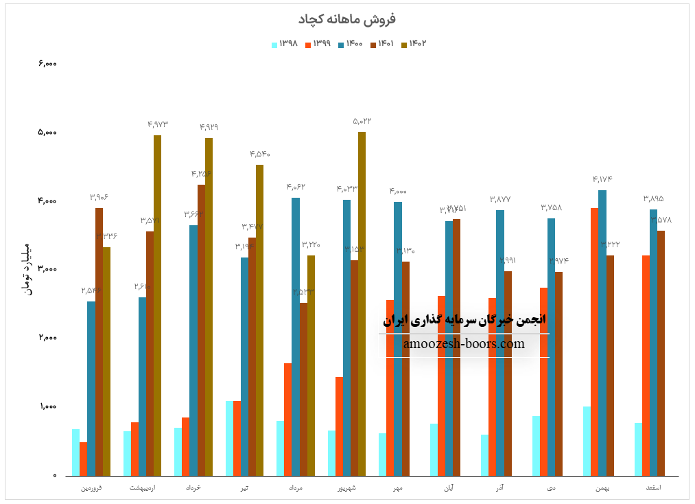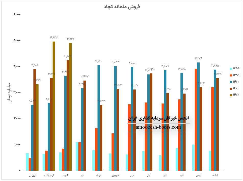 در گزارش فعالیت ماهانه نماد کچاد 3220.5 میلیارد تومان فروش به ثبت رسیده است که در مقایسه با ماه گذشته و متوسط ماهانه کاهش 28 درصدی داشته است.