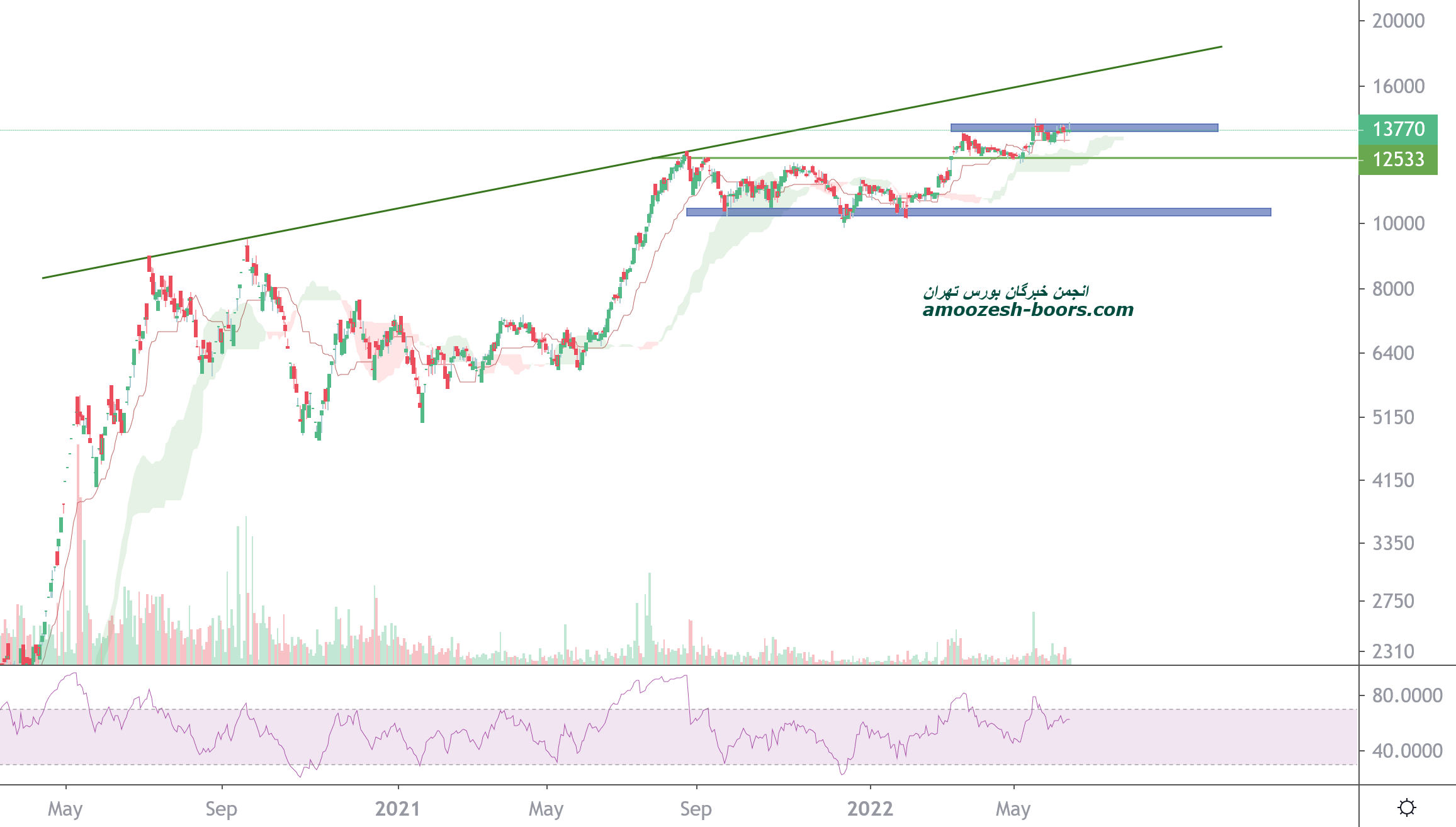 در حال حاضر قیمت درگیر مقاومت 14000 ریال میباشد در صورتی که موفق به عور از این محدوده شود حرکت قیمت تا 17000 ریال دور از ذهن نخواهد بود و در صورتی که قیمت وارد فاز اصلاحی شود اولین و دومین حمایت سهم به ترتیب 12500 و 10000 ریال در نظر گرفته خواهند شد که در صورت از دست رفتن حمایت اول حد ضرر سهم فعال خواهد شد.