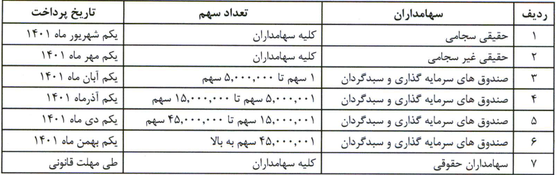 بدینوسیله برنامه زمانبندی سود نقدی پیشنهادی هیات مدیره برای سال مالی منتهی به ۲۹ اسفندماه ۱۴۰۰ به شرح زیر جهت اطلاع سهامداران محترم اعلام می گردد:
