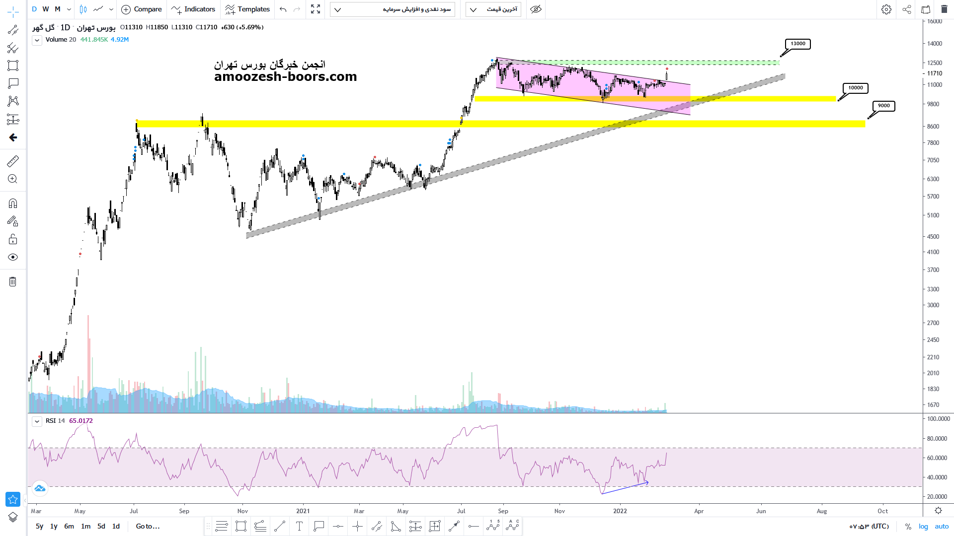 قیمت پس از تصویب افزایش سرمایه شرکت و بازگشایی نماد با ۷ % رشد در روز بازگشایی توانست از کانال نزولی خود خارج شده و اکنون باید به دنبال تثبیت بر روی مقاومت شکسته شده باشد انتظار میرود با برخورد به مقاومت محدوده ۱۳۰۰ تومان پولبکی را به این ناحیه آغاز کرده سپس پس از تایید پولبک به رشد خود ادامه دهد اما در صورت بروز واکنش منفی به محدوده مقاومتی هزار و ۳۰۰ تومان روند خنثی را در یک کانالی برای سهم متصور می شویم تا بین محدوده د 1000 و ۱۳۰۰ تومان نوسان خود را ادامه دهد.