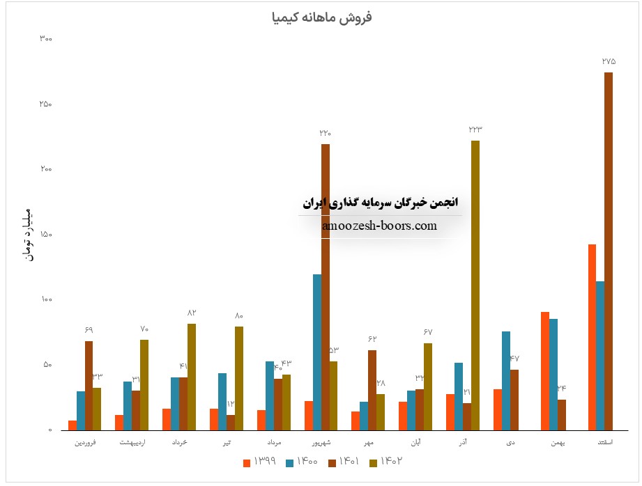 فروش آذر ماه سال 1402 سهم کیمیا 222.5 میلیارد تومان گزارش شده است که 24% از این رقم از طریق فروش داخلی و مابقی از طریق صادرات تامین گردیده است، تغییرات درآمدی کیمیا به شرح زیر میباشد: