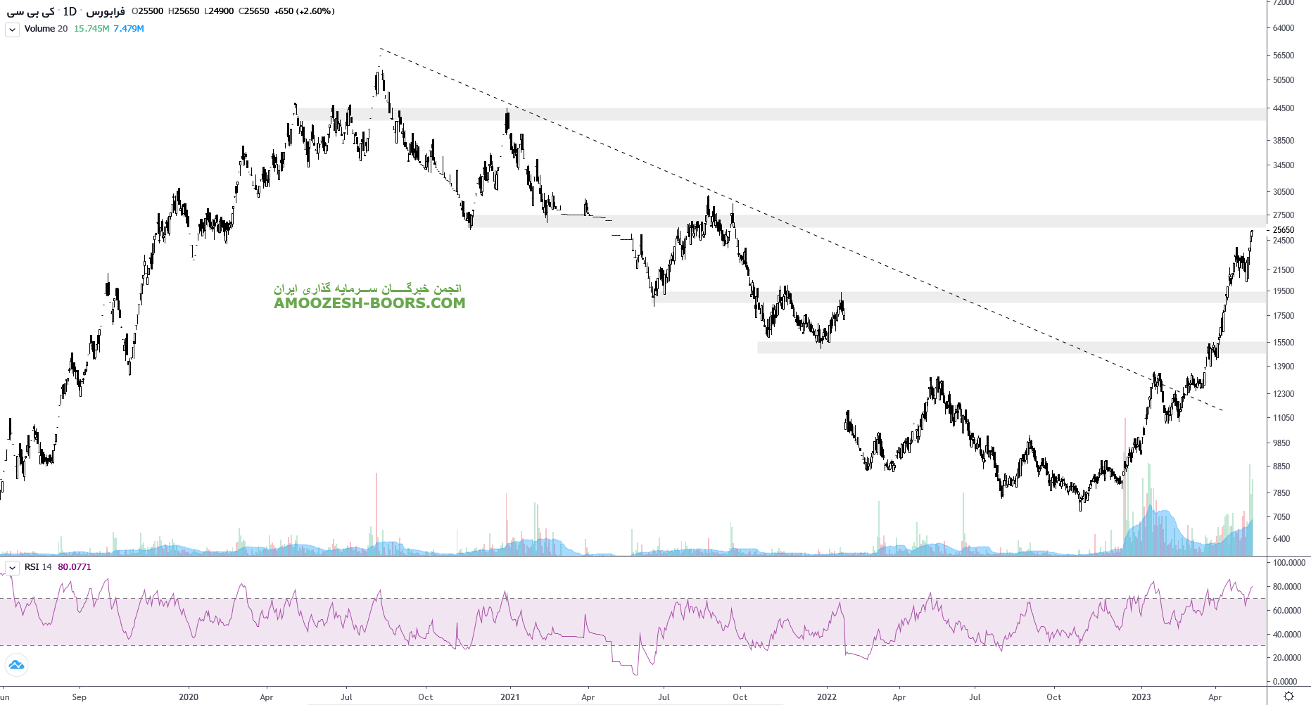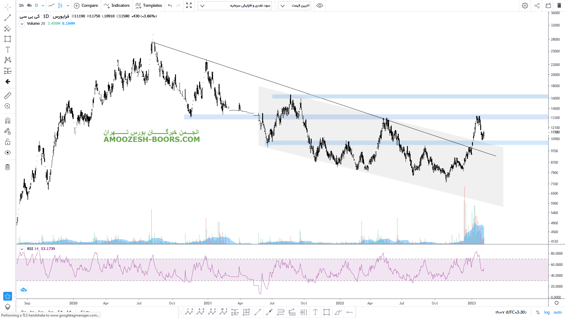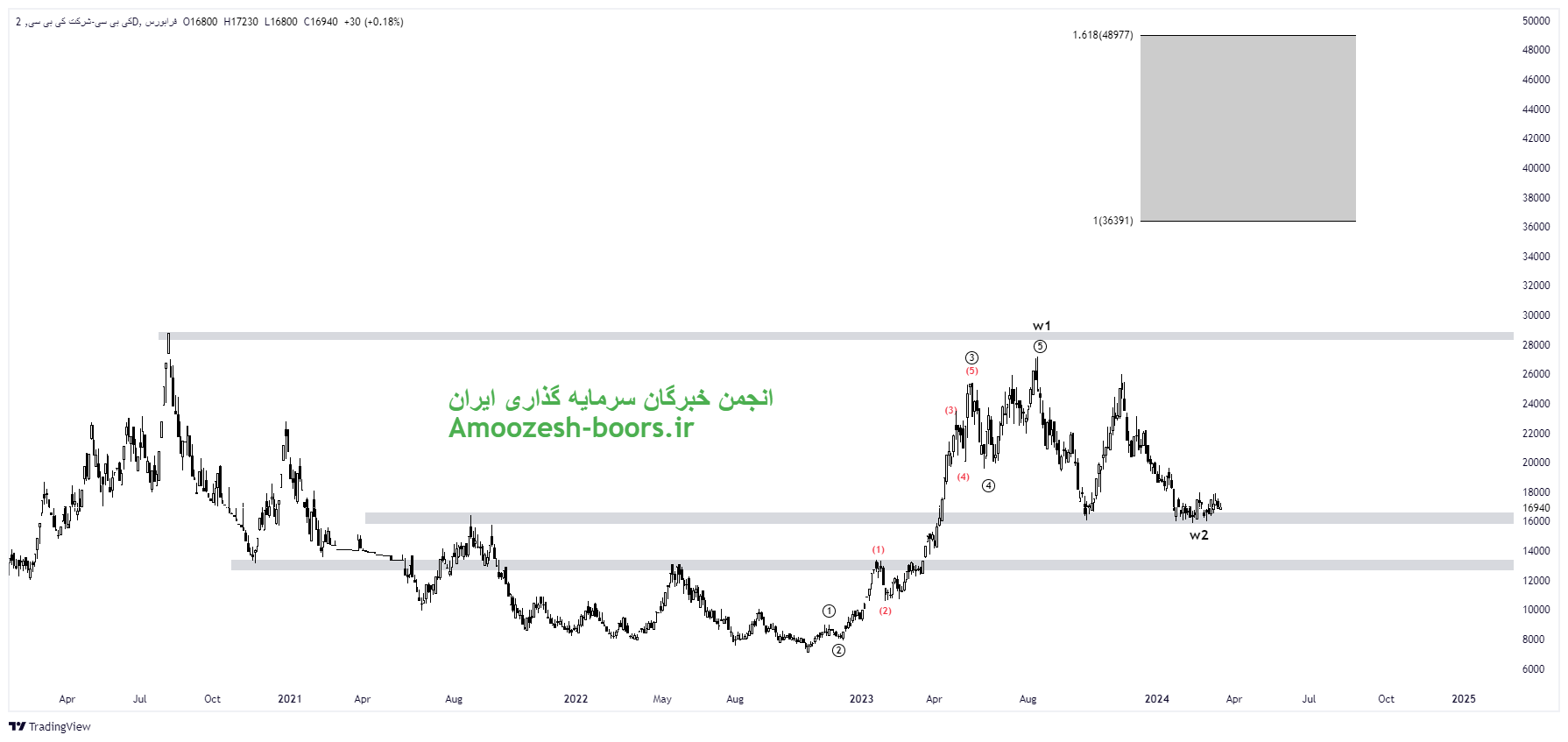 سهم کی بی سی بر روی محدوده حمایتی ۱۶۰۰۰ ریال قرار گرفته است. لذا در صورت ایجاد تقاضا در این ناحیه و عبور از مقاومت ناحیه 28500 ریال، سهم کی بی سی به مدار صعودی خود بازگشته و لذا در در همین مسیر مقاومتهای ناحیه ۳۶۰۰۰ ریال و ۴۹۰۰۰ ریال مهمترین مقاومتهای سهم کی بی سی محسوب میشود. همچنین در صورت از دست رفتن حمایت ناحیه ۱۶۰۰۰ ریال نزدیکترین حمایت سهم کی بی سی ناحیه 13000 ريال در نظر گرفته خواهد شد.