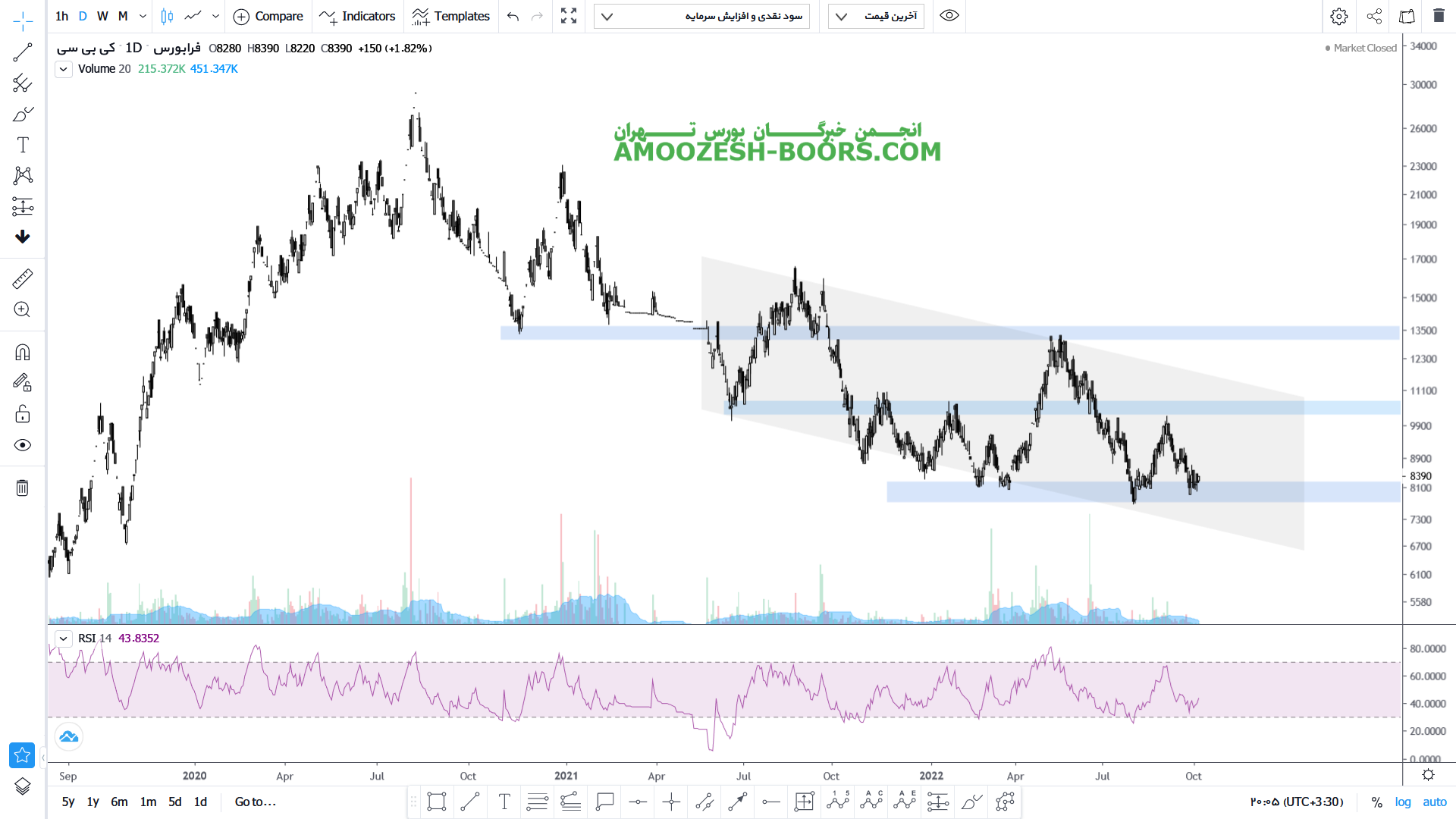 قیمت سهم کی بی سی پس از برخورد به ناحیه مقاومتی 1000 تومان وارد اصلاح شده و اکنون نیز بر روی ناحیه حمایتی 800 تومان قرار دارد که درصورت حمایت میتواند سیگنال صعودی صادر شود و مجددا تا مقاومت ناحیه 1100 تومان رشد کند. درصورت شکست این ناحیه مقاومتی و خروج از سقف کانال نزولی قیمت سهم کی بی سی میتواند رشد خود را تا ناحیه 1350 تومان نیز ادامه دهد .