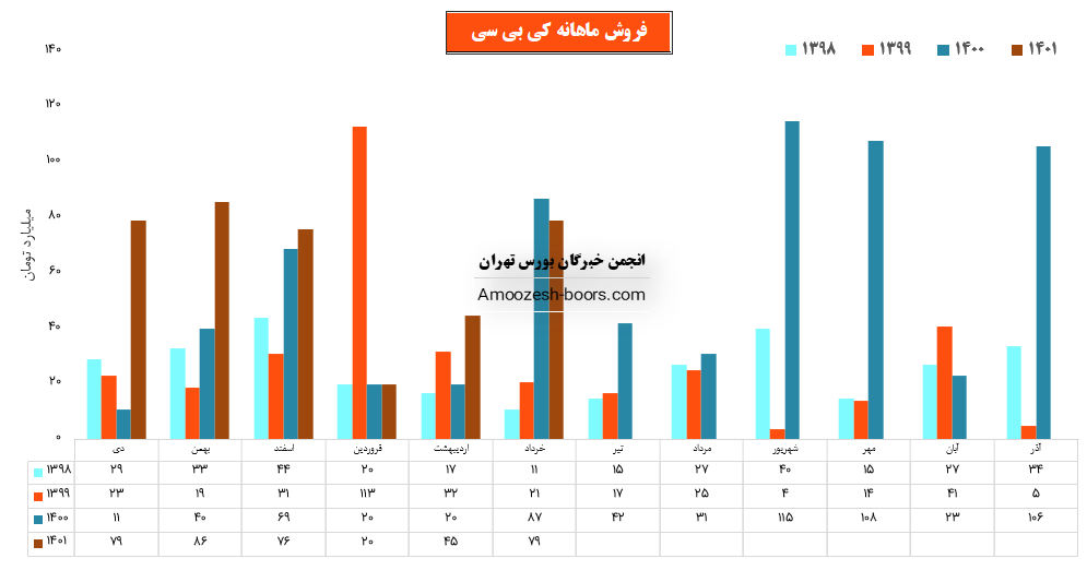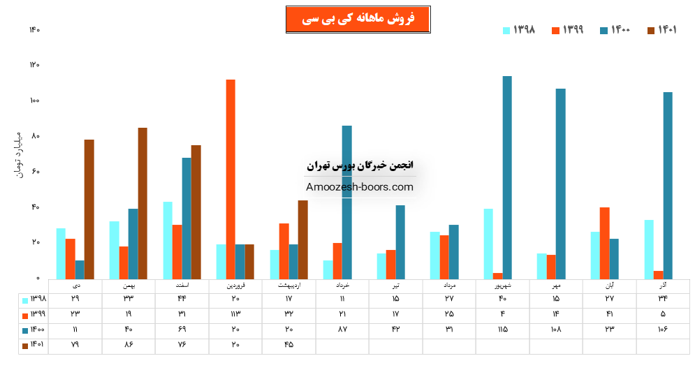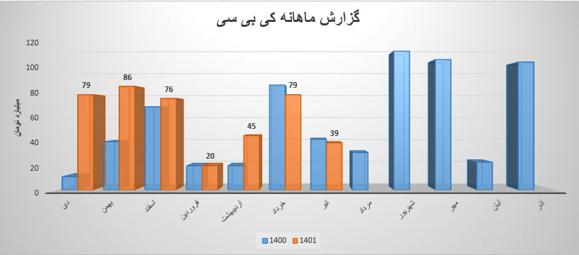 سهم کی بی سی در فروردین ماه ۱۴۰۱ حدود مبلغ ۲۰ میلیارد تومان درآمد داشته که این میزان در مقایسه با ماه گذشته ۷۴ % کاهش و همچنین در مقایسه با مدت مشابه سال گذشته بدون تغییر مانده است.