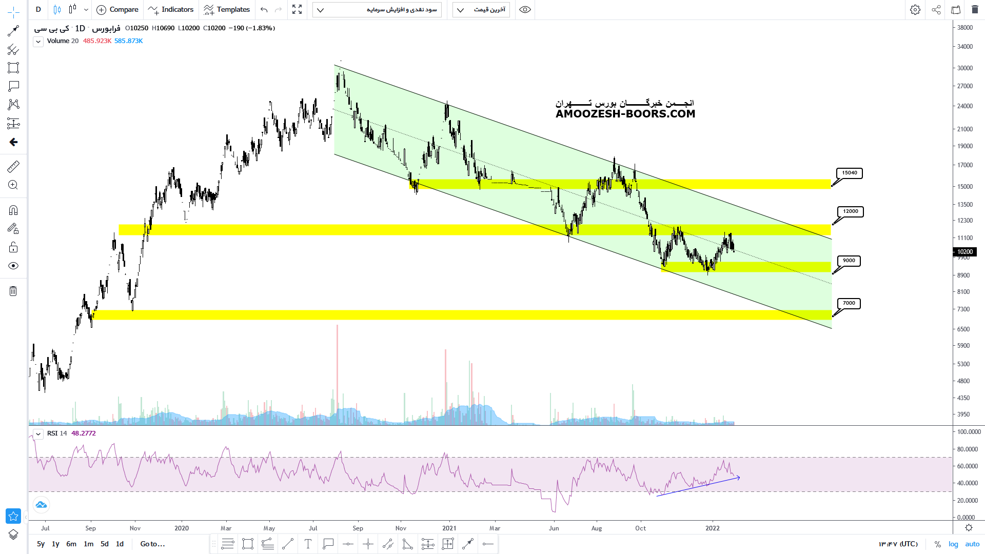 اما درصورت شکست مقاومت 1200 و خروج از سقف کانال قیمت سهم کی بی سی می تواند رشد خود را تا محدوده 1500 تومان نیز ادامه دهد اما در صورتیکه قیمت کف حمایتی 900 تومان را بشکند می تواند تا محدوده کف کانال نزولی خود یعنی محدوده 700 تومان نزول خود را ادامه دهد